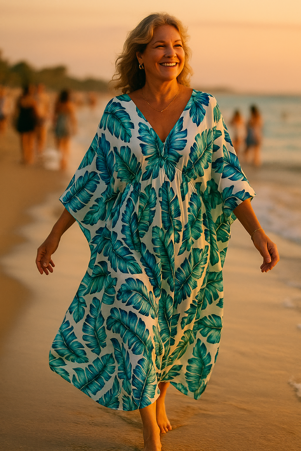 Luce fabulosa bajo el sol con nuestro Kaftán Riviera, una prenda fluida y llamativa, ideal para días de playa y paseos al atardecer.